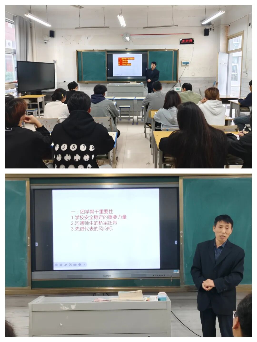 会上,学管副院长王伟就团学骨干的重要性和必备素质等部分进行了深入的分析与讲解,同时为同学们阐述了学生干部的工作目标和工作方式。在讲解过程中,他针对各个部门提出有效建议,指导同学们要强化责任担当意识,认清自身职能,积极发挥桥梁服务作用。此外,也要注重培养自己的引领能力、沟通技巧和时间管理能力,强化创新意识。