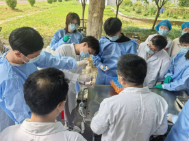 实训严格按照动物福利与生物安全规范进行。在专业教师朱平军,赵庆峰全程指导下,学生们系统学习了鸡只安全保定、翅静脉与心脏采血的标准操作流程、抗凝血处理及医疗废弃物处置等关键环节。教师先进行规范化演示,强调操作轻柔、定位准确、快速完成,最大限度降低动物应激。随后,学生分组在模拟实训模型和实验鸡只上进行反复操练,从消毒、进针角度、采血量控制到标本保存,每一个步骤都力求精准、规范。